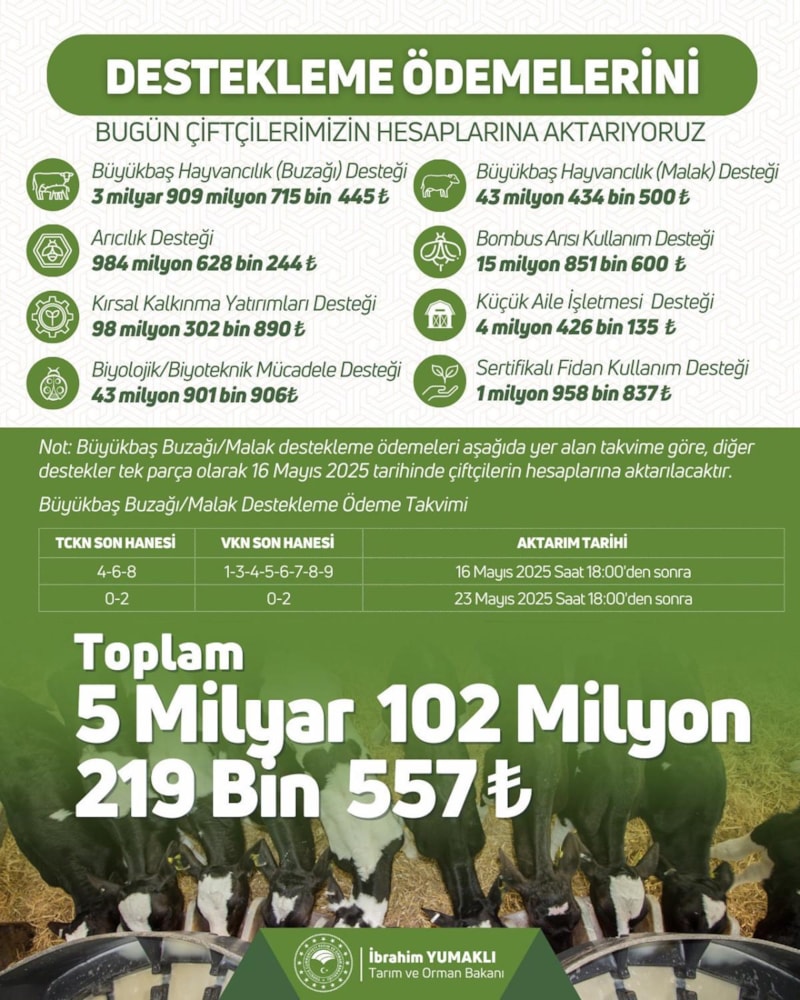 Paylaşımda yer alan bilgilere göre, büyükbaş hayvancılık (buzağı) desteği 3 milyar 909 milyon 715 bin 445 lira, büyükbaş hayvancılık (malak) desteği 43 milyon 434 bin 500 lira, arıcılık desteği 984 milyon 628 bin 244 lira, bombus arısı kullanım desteği 15 milyon 851 bin 600 lira, kırsal kalkınma yatırımları desteği 98 milyon 302 bin 890 lira, küçük aile işletmesi desteği 4 milyon 426 bin 135 lira, biyolojik/biyoteknik mücadele desteği 43 milyon 901 bin 906 lira, sertifika fidan kullanım desteği 1 milyon 958 bin 837 lira olarak belirlendi.