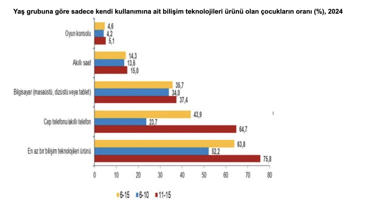 -Sadece kendi kullanımında en az bir bilişim teknoloji ürünü olan çocukların oranı yüzde 63,8 oldu.