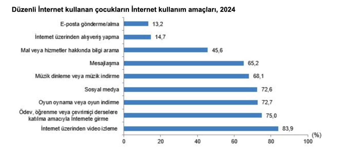 Çocuklarda internet kullanımı, 2021 yılında yüzde 82,7 iken 2024 yılında yüzde 91,3 oldu.