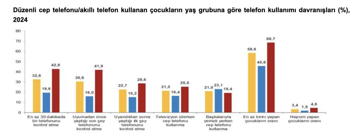 -Çocukların yüzde 32,6'sı her yarım saate bir cep telefonu/akıllı telefonunu kontrol etti.
