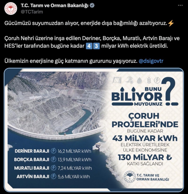 Tarım ve Orman Bakanlığı, Çoruh Nehri üzerine inşa edilen hidroelektrik santralleri (HES) tarafından bugüne kadar üretilen elektrik miktarı ve ülke ekonomisine sağlanan katkıyı paylaştı.