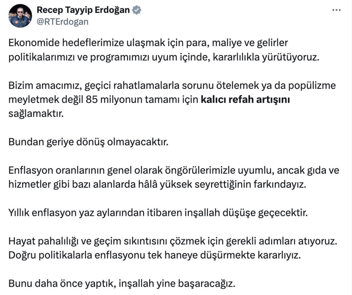 Ekonomide hedeflerimize ulaşmak için para, maliye ve gelirler politikalarımızı ve programımızı uyum içinde, kararlılıkla yürütüyoruz. Bizim amacımız, geçici rahatlamalarla sorunu ötelemek ya da popülizme meyletmek değil 85 milyonun tamamı için kalıcı refah artışını sağlamaktır. Bundan geriye dönüş olmayacaktır.