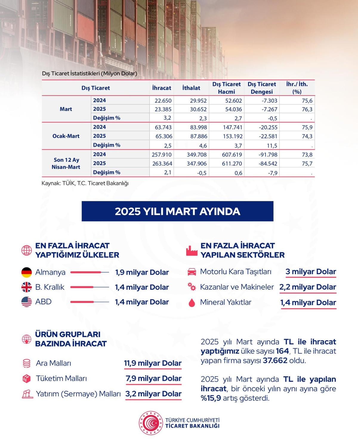 Ömer Bolat, sosyal medya hesabından"28 Mart 2025 Cuma günü gerçekleşen 2 milyar 65 milyon dolarlık günlük mal ihracatı, 101 yıllık Cumhuriyet tarihimizin en yüksek 2'nci günlük ihracat rakamı olarak tarihe geçmiştir." dedi.