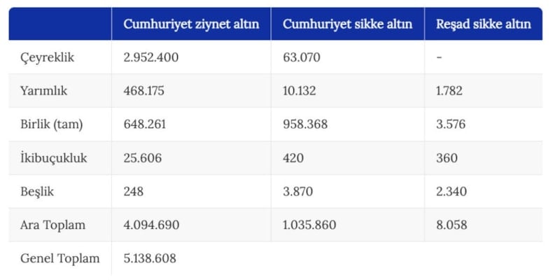 Basılan altınların 4 milyon 94 bin 690'ı ziynet Cumhuriyet altını olurken, 1 milyon 35 bin 860'ı sikke Cumhuriyet altını ve 8 bin 58'i Reşad sikke altınından oluştu.