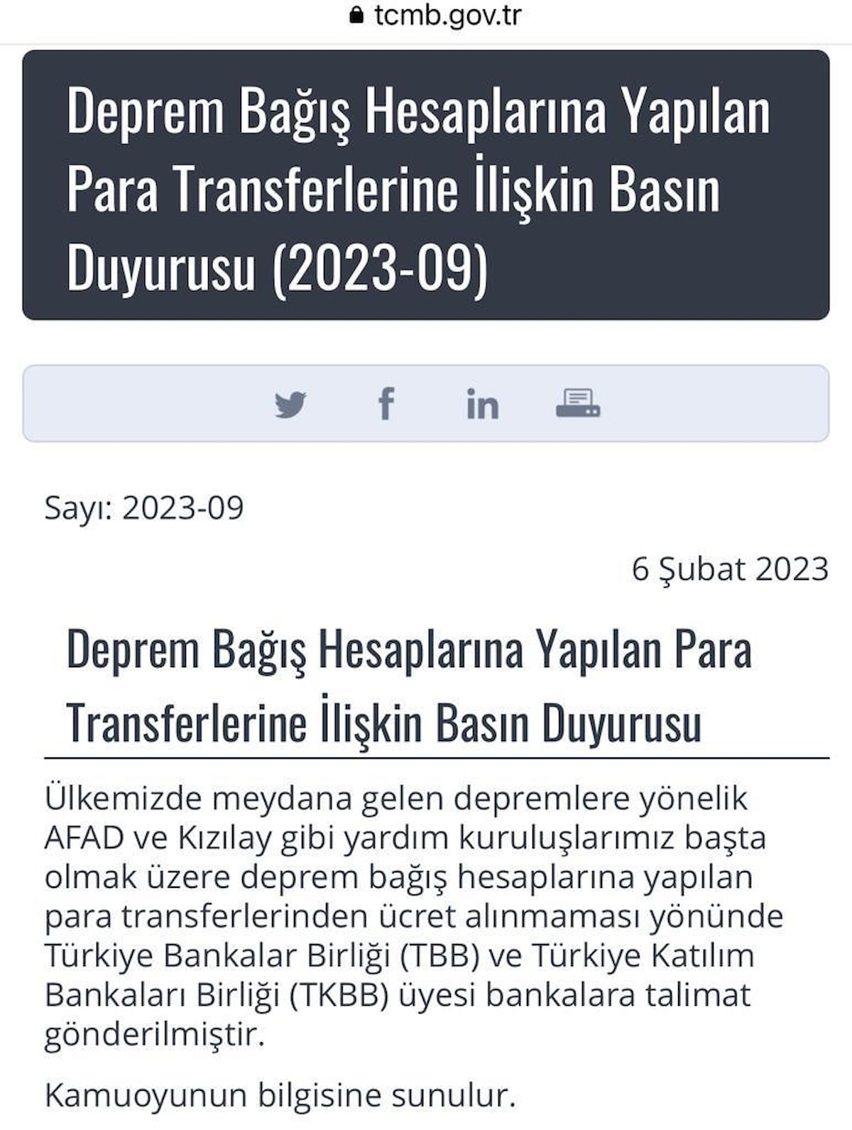 Ülkemizde meydana gelen depremlere yönelik AFAD ve Kızılay gibi yardım kuruluşlarımız başta olmak üzere deprem bağış hesaplarına yapılan para transferlerinden ücret alınmaması yönünde Türkiye Bankalar Birliği (TBB) ve Türkiye Katılım Bankaları Birliği (TKBB) üyesi bankalara talimat gönderilmiştir.