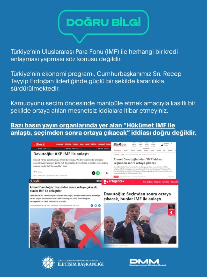 Dezenformasyonla Mücadele Merkezi, sosyal medya hesabından bir mesaj yayınlayarak bazı basın yayın organlarında yer alan “Hükümet IMF ile anlaştı, seçimden sonra ortaya çıkacak” iddiasının gerçeği yansıtamadığını dile getirdi.
