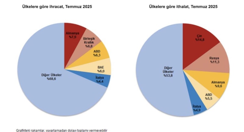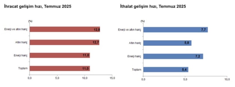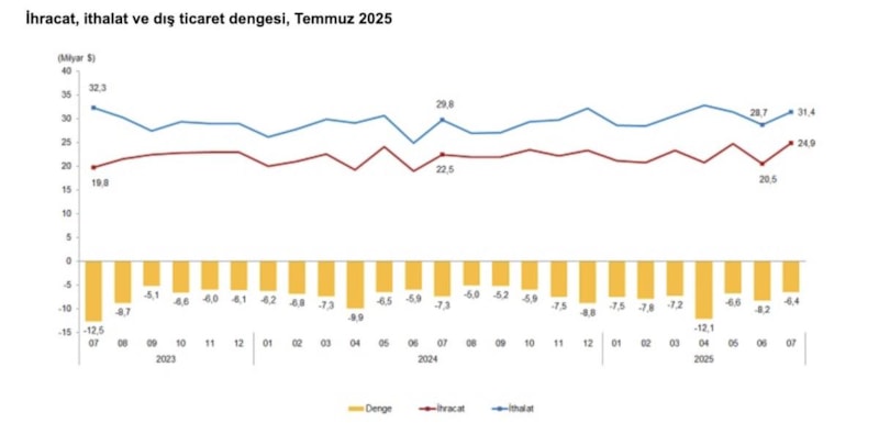 TÜİK ile Ticaret Bakanlığı iş birliğiyle genel ticaret sistemi kapsamında üretilen geçici dış ticaret verilerine göre; ihracat 2025 yılı Temmuz ayında, bir önceki yılın aynı ayına göre yüzde 11 artarak 24 milyar 938 milyon dolar, ithalat yüzde 5,4 artarak 31 milyar 383 milyon dolar olarak gerçekleşti.