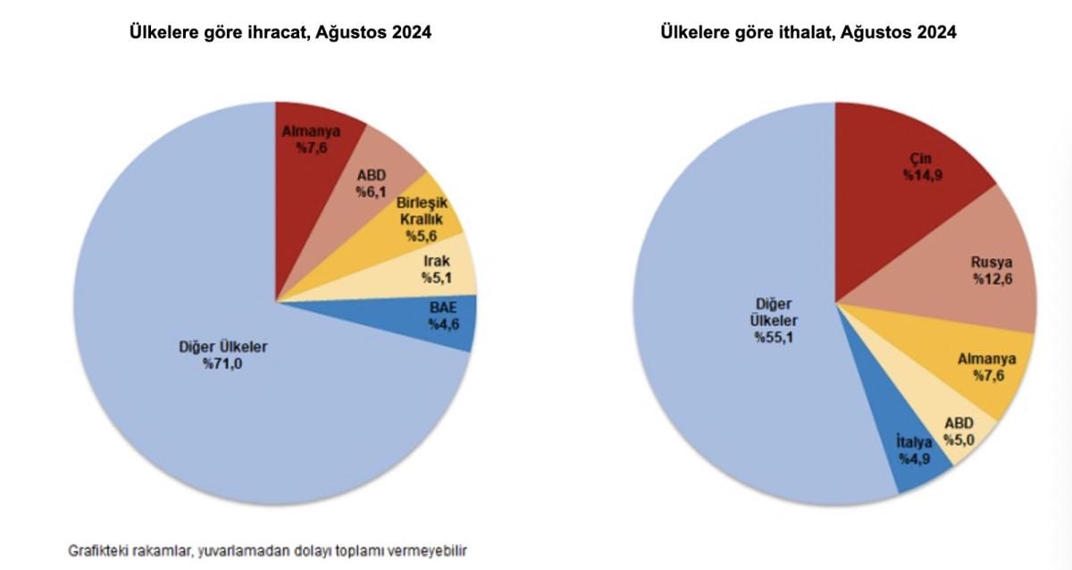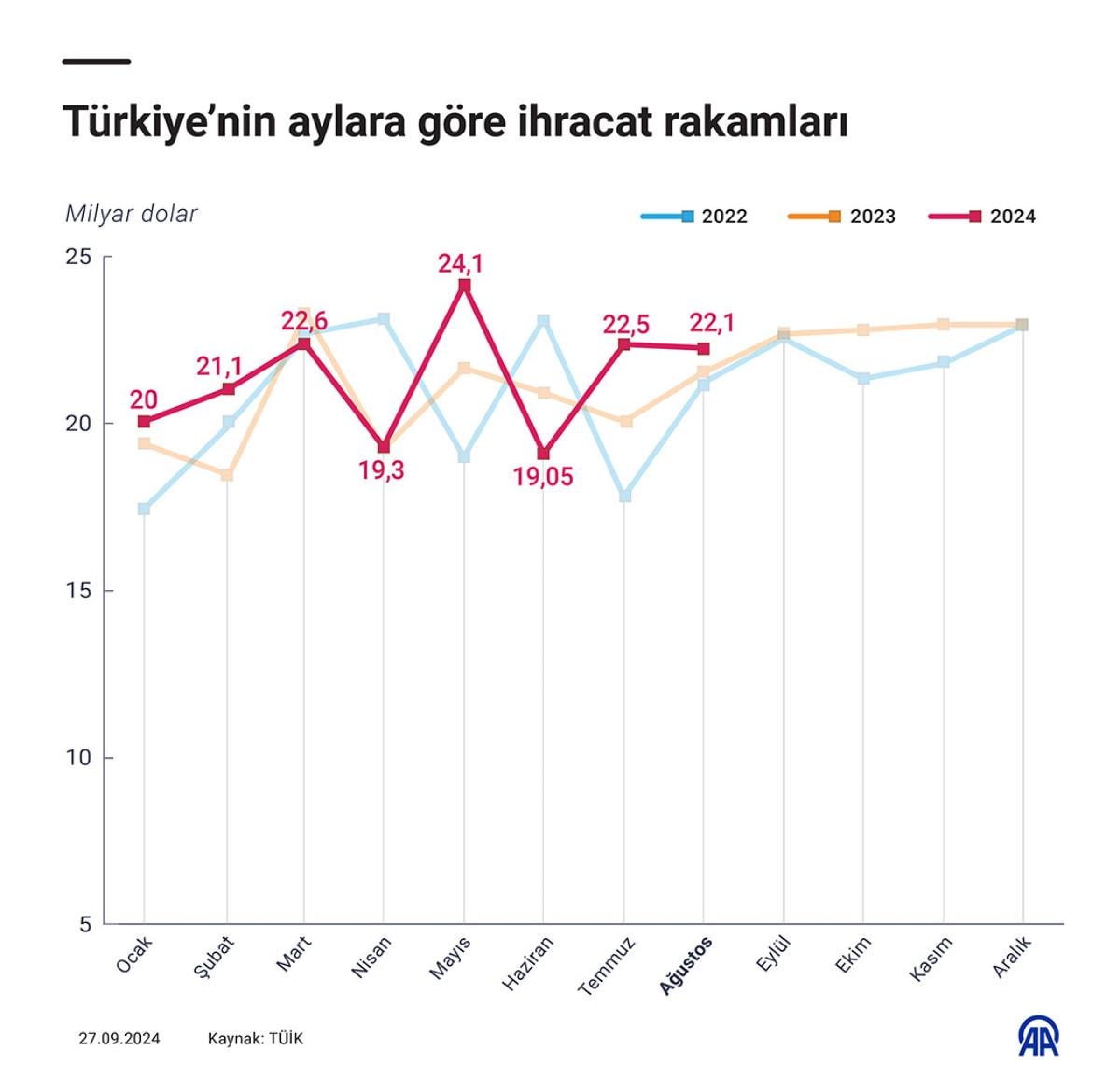 TÜİK ile Ticaret Bakanlığı iş birliğiyle genel ticaret sistemi kapsamında üretilen geçici dış ticaret verilerine göre; ihracat 2024 yılı Ağustos ayında, bir önceki yılın aynı ayına göre yüzde 2,3 artarak 22 milyar 48 milyon dolar, ithalat yüzde 10,7 azalarak 27 milyar 40 milyon dolar olarak gerçekleşti.