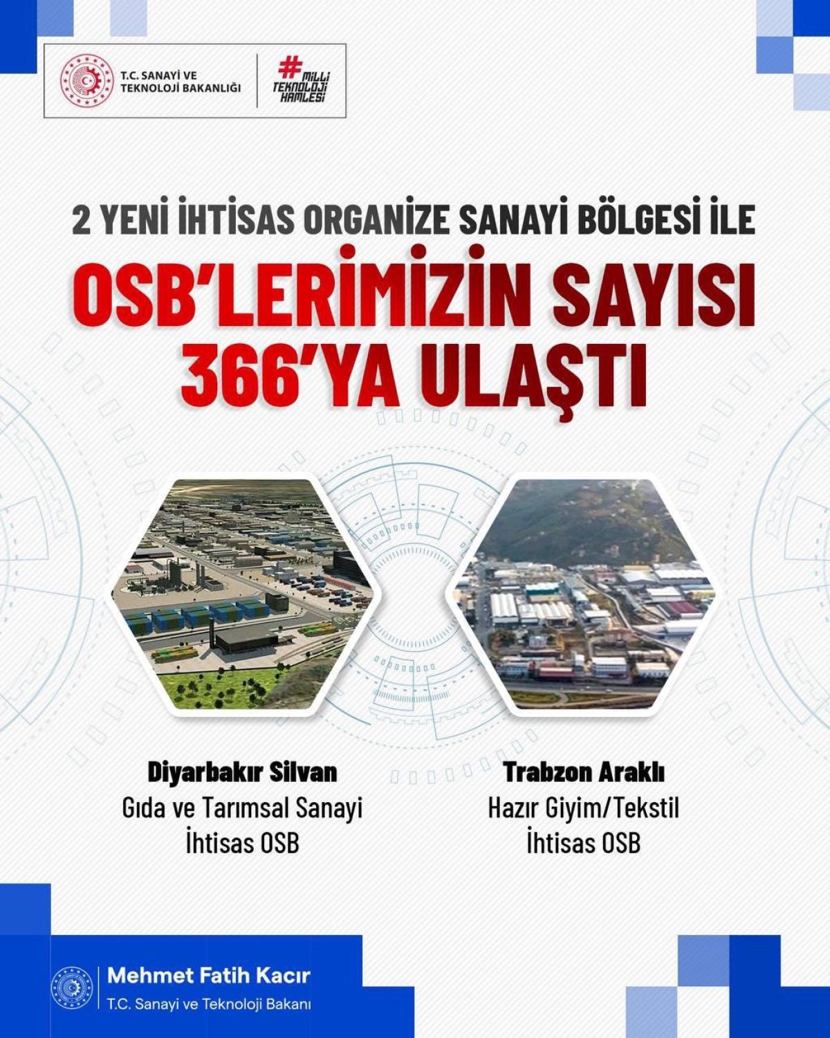 Diyarbakır Silvan Gıda ve Tarımsal Sanayi İhtisas ile Trabzon Araklı Hazır Giyim-Tekstil İhtisas OSB'yi ülkemize kazandırdık. Yeni OSB'lerimizle yaklaşık 3 milyon metrekare büyüklüğünde planlı sanayi alanı oluşturduk, toplam OSB sayımızı 366'ya yükselttik.