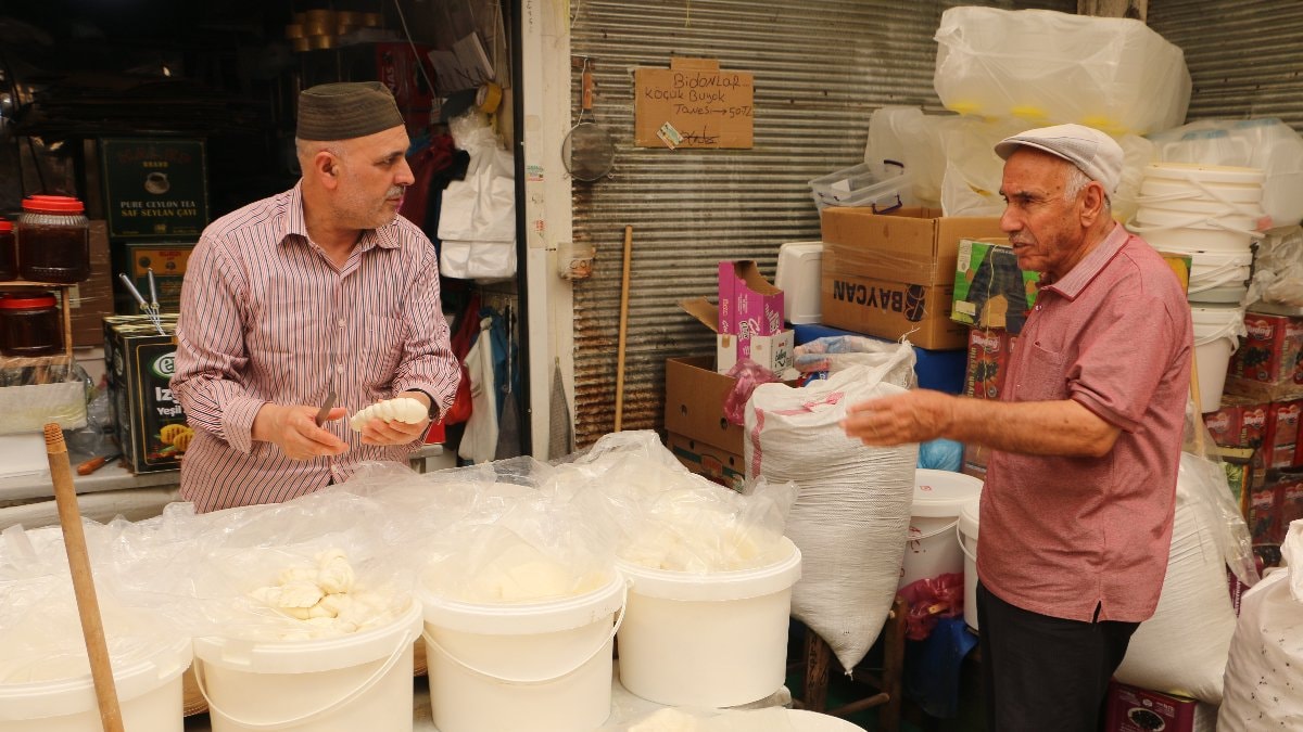 Tarihi Sur ilçesindeki peynirciler pazarında işletmeci olan Nezir Temer, taze peynirleri bidonlara bırakıp, tuzladıklarını ve kışa hazırladıklarını söyledi.