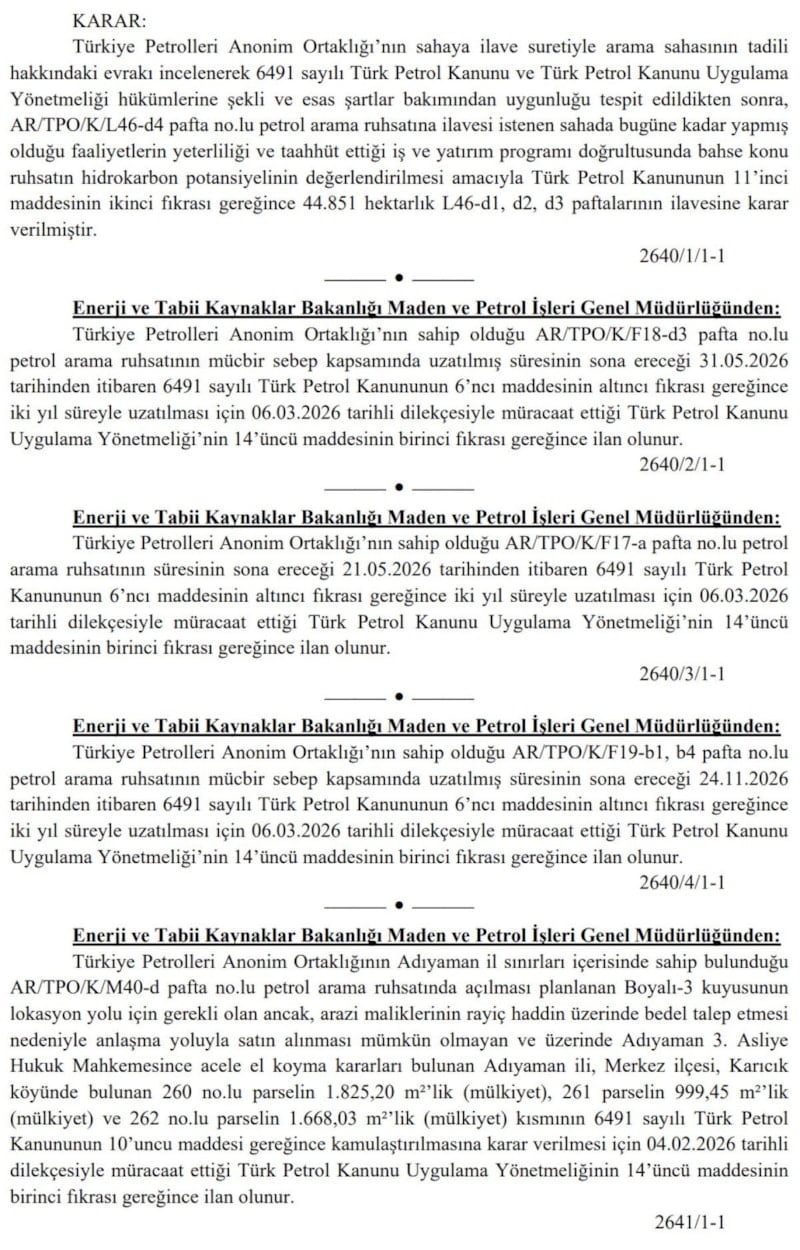 Buna göre, AR/TPO/K/F18-d3 pafta no'lu petrol arama ruhsatının 31 Mayıs 2026 tarihinden itibaren, AR/TPO/K/F17-a pafta no'lu ruhsatın 21 Mayıs 2026'dan itibaren ve AR/TPO/K/F19-b1, b4 pafta no'lu petrol arama ruhsatının 24 Kasım 2026'dan itibaren ikişer yıl uzatılması için başvuru yapıldı.