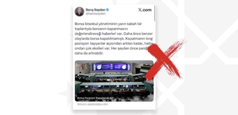 Bazı sosyal medya hesaplarında, "Borsa İstanbul’un pazartesi günü işlemlere kapatılmasının değerlendirildiği ya da bu yönde bir karar alınacağına ilişkin iddialar" dolaşıma sokulmaktadır.