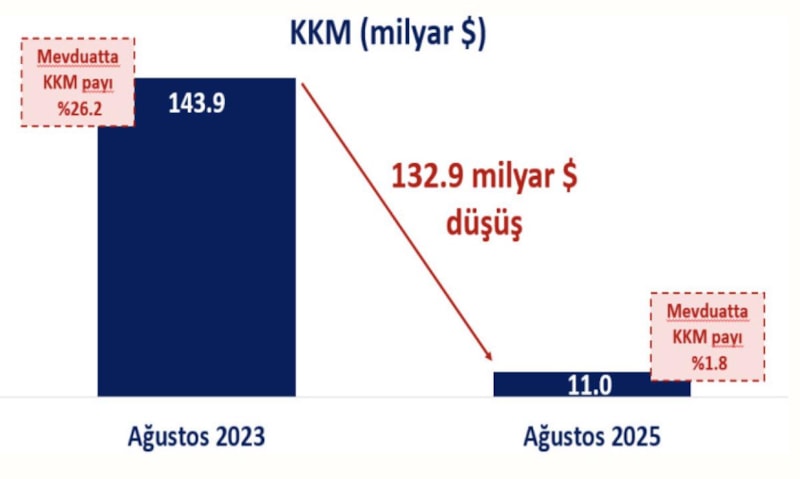 Ağustos 2023’te yaklaşık 144 milyar dolarla en yüksek seviyesini gören kur korumalı mevduat (KKM) bakiyesi, 15 Ağustos 2025 tarihi itibarıyla 11 milyar dolara geriledi.