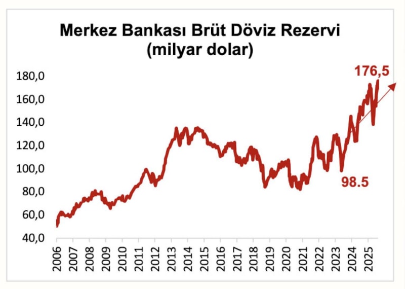 Program öncesi dönem olan 26 Mayıs 2023 tarihinde 98,5 milyar dolar olan brüt rezervlerimiz, 15 Ağustos 2025 itibarıyla 176.5 milyar dolara çıktı.