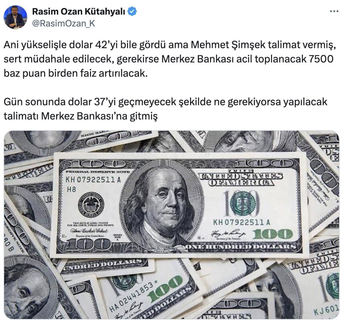 Gazeteci Yazar Rasim Ozan Kütahyalı'nın, doların artması ile ilgili sosyal medya üzerinden paylaştığı; Hazine ve Maliye Bakanı Mehmet Şimşek'in devreye girdiği ve Türkiye Cumhuriyet Merkez Bankası'nın (TCMB) adım atmasının beklendiğine dair mesajı şöyle: