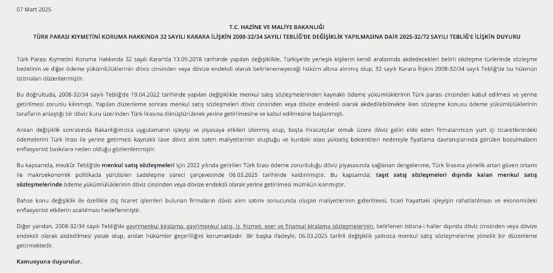 Bu kapsamda, mezkur Tebliğ’de menkul satış sözleşmeleri için 2022 yılında getirilen Türk lirası ödeme zorunluluğu döviz piyasasında sağlanan dengelenme, Türk Lirası'na yönelik artan güven ortamı ile makroekonomik politikada yürütülen sadeleşme süreci çerçevesinde 6 Mart 2025 tarihinde kaldırılmıştır.