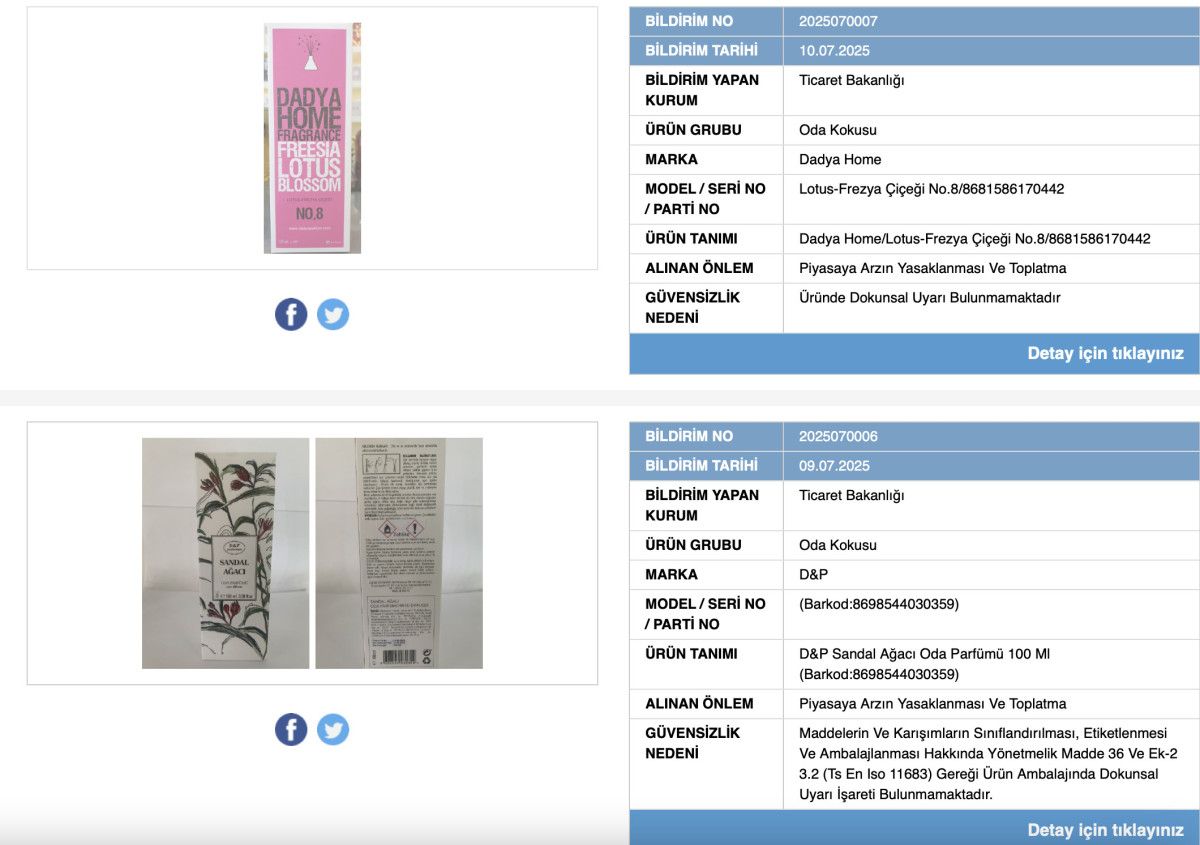 Toplatılma kararı verilen ürünler arasında Dadya Home, D&P ve Zara Home markalarına ait oda kokuları yer alıyor.
