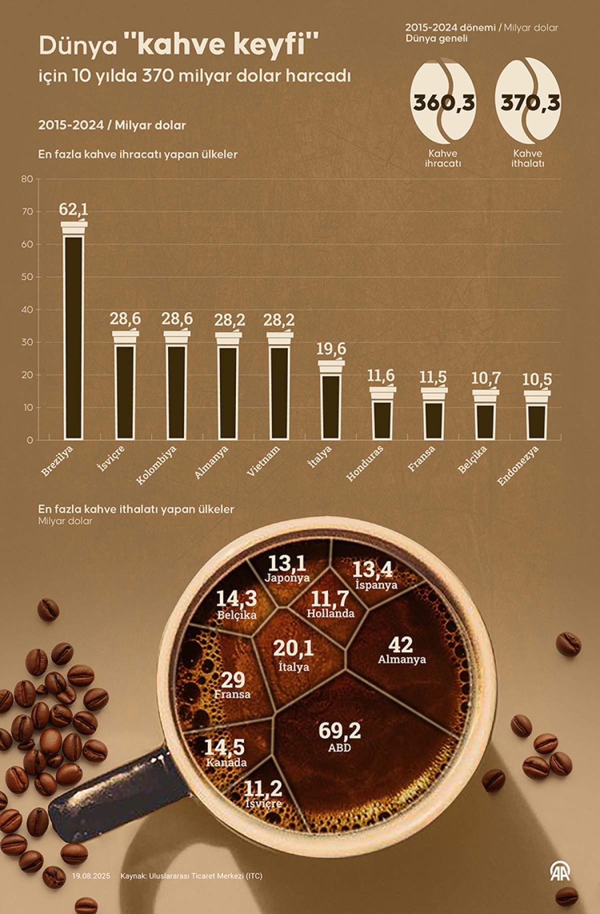 Bu kapsamda, dünya genelinde 2015-2024 döneminde 370,3 milyar dolarlık kahve ithalatı yapılırken, 69 milyar 227 milyon dolarla ABD ilk sırada geldi. Bu ülkeyi, 41 milyar 962 milyon dolarla Almanya ve 28 milyar 987 milyon dolarla Fransa izledi.