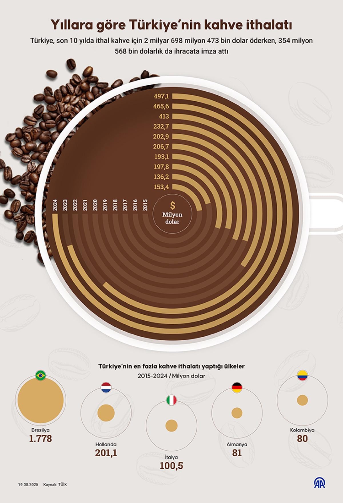 Bu çerçevede Türkiye 2015-2024 döneminde, kahve ithalatına 2 milyar 698 milyon 473 bin dolar ödedi. İthal kahvenin, 2015'te 153 milyon 392 bin dolar olan faturası, aradan geçen 10 yılda yüzde 224,1 artarak 2024'te 497 milyon 91 bin dolara yükseldi.
