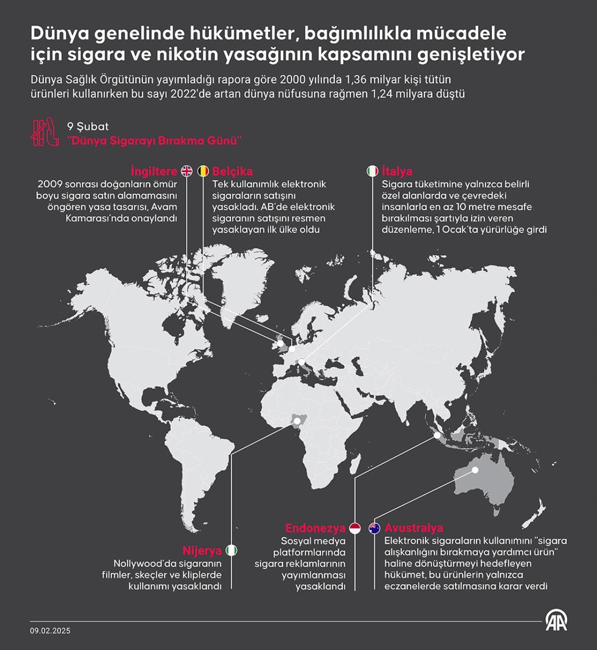 DSÖ'nün 2024'te yayımladığı dünya çapındaki tütün kullanımına ilişkin rapora göre, 2000 yılında 1,36 milyar kişi tütün ürünleri kullanırken bu sayı, 2022'de artan dünya nüfusuna rağmen 1,24 milyara düştü.