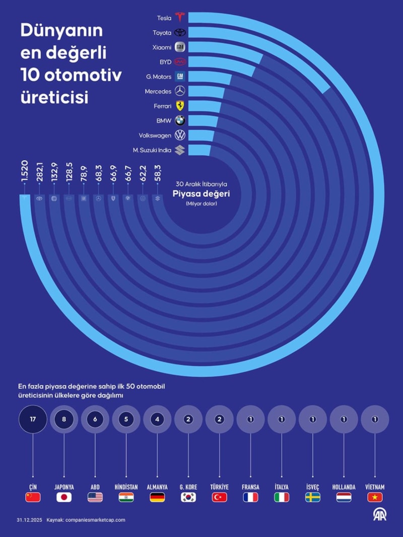 En fazla piyasa değerine sahip ilk 50 otomobil üreticisinin ülkelere göre dağılımına bakındığında 30 Aralık itibarıyla hazırlanan sıralamada Tesla'nın, 1,1 trilyon doları aşan piyasa değeriyle lider olduğu görülüyor.