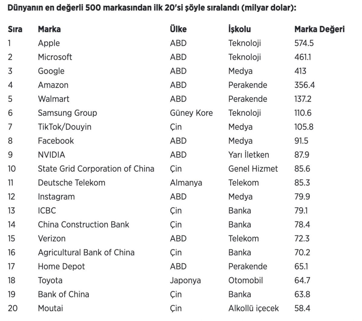 Brand Finance'ın "Dünyanın En Değerli 500 Markası" çalışmasında zirve değişmedi.