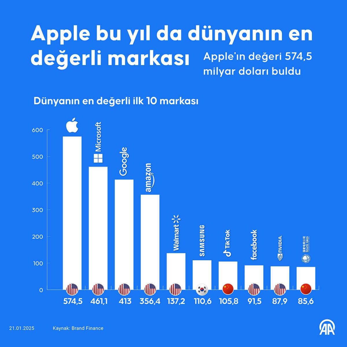 Apple, 574,5 milyar dolarla geçen yıl olduğu gibi dünyanın en değerli markası belirlendi. Şirketin marka değeri 2024'te 516,6 milyar dolardı.