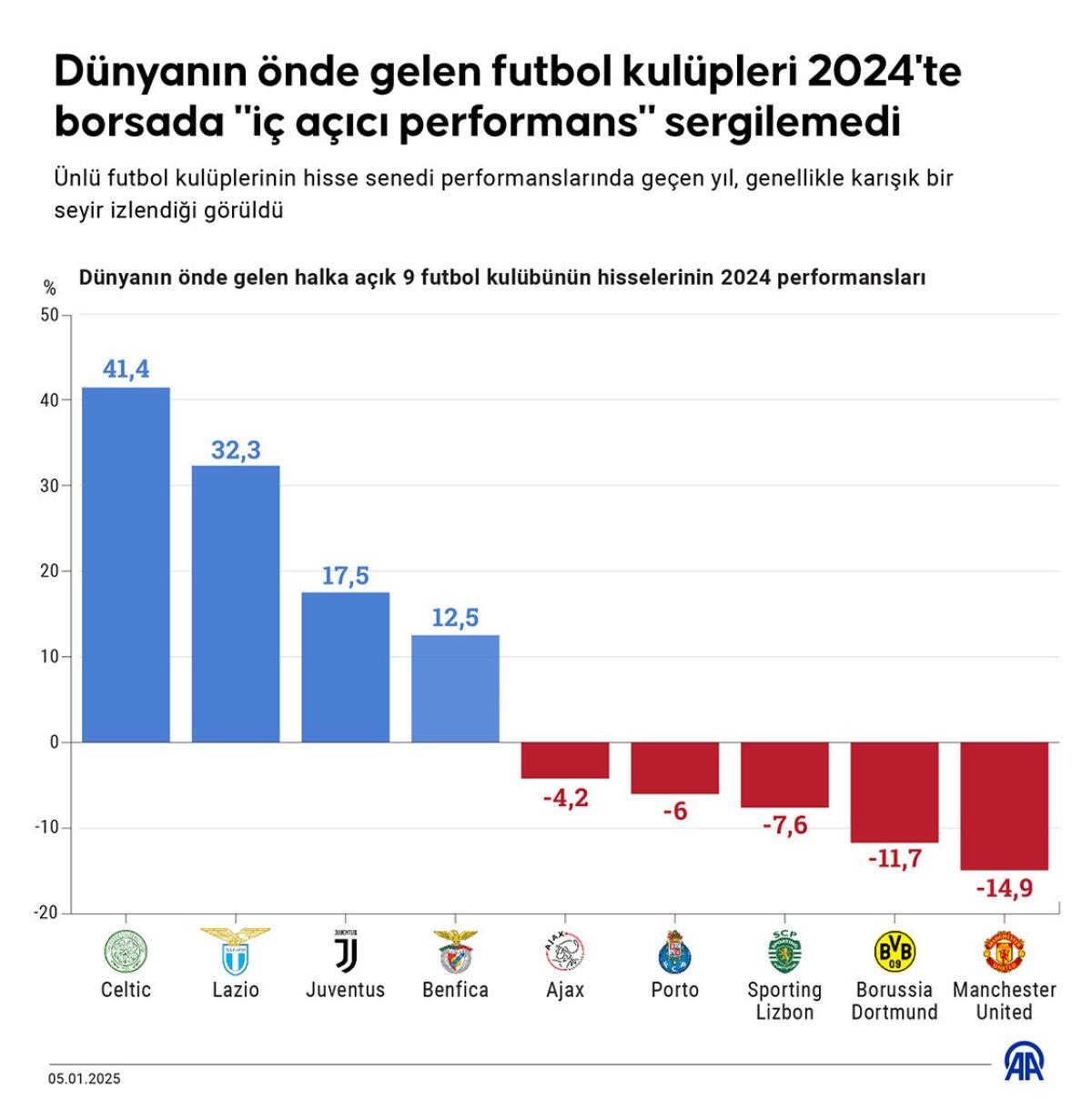 Geçen yıl yatırımcısına Hollanda ekibi Ajax yüzde 4,2, Portekiz ekiplerinden Porto yüzde 6, Sporting CP yüzde 7,6, Alman ekibi Borussia Dortmund yüzde 11,7, İngiliz ekibi Manchester United yüzde 14,9 kaybettirdi.