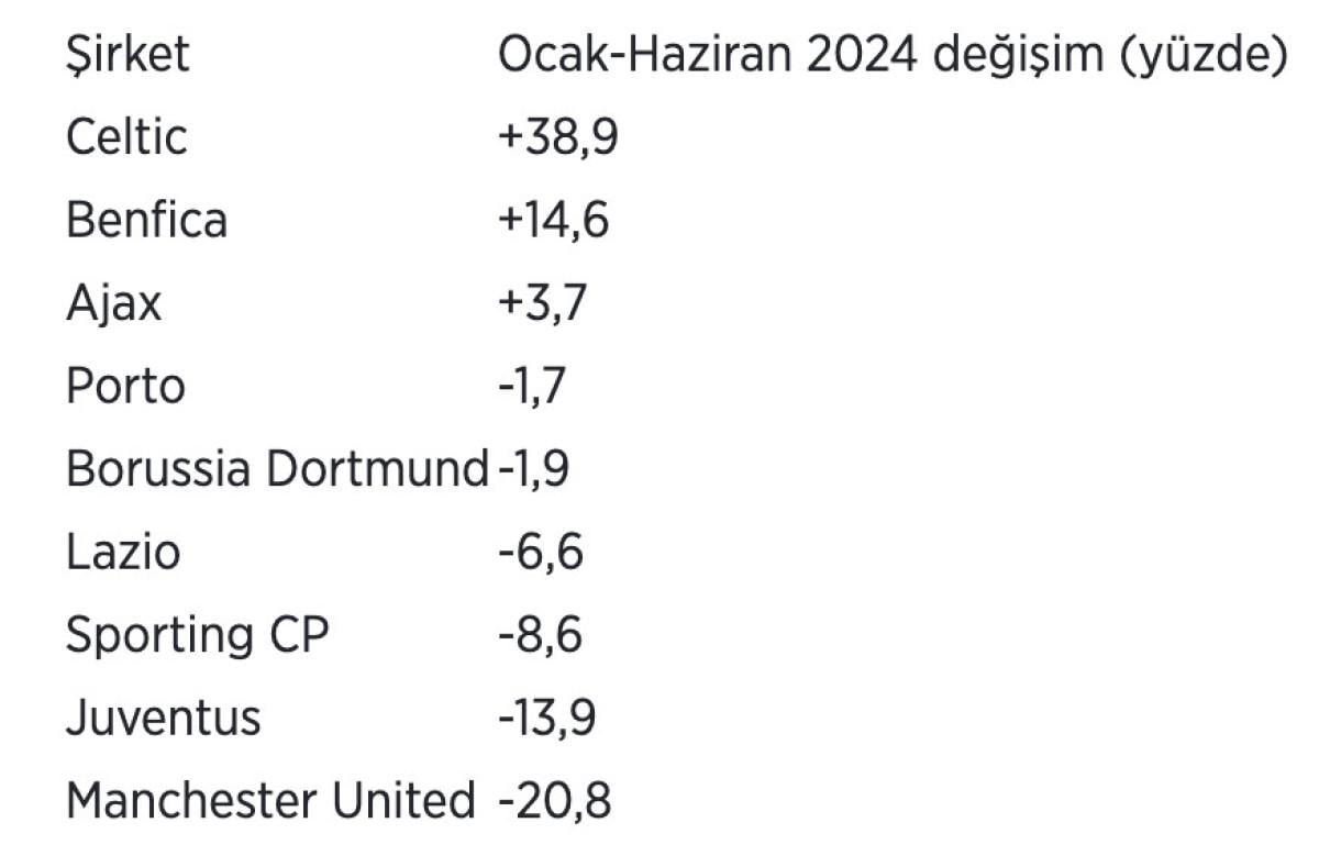 Ocak-haziran döneminde yatırımcısına İskoç kulübü Celtic yüzde 38,9, Portekiz kulübü Benfica yüzde 14,6, Hollanda kulübü Ajax yüzde 3,7 kazandırdı.