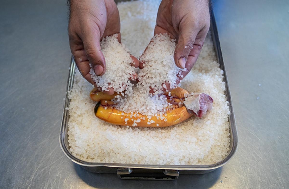 Yumurtalar çıkarıldıktan sonra tuzda bekletme, tuzlanmasından sonra buz dolu kasede kanının akıtılması ve ardından kurutulma işlemlerinden sonra sunuluyor.