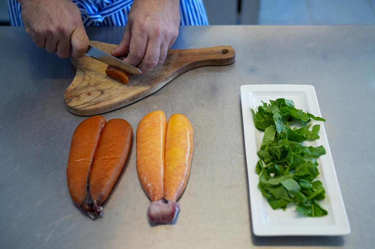 Bottarga, dişi (topan) kefal balığının yumurta kesesi özenle çıkarılıp geleneksel yöntemlerle işlenerek hazırlanıyor.