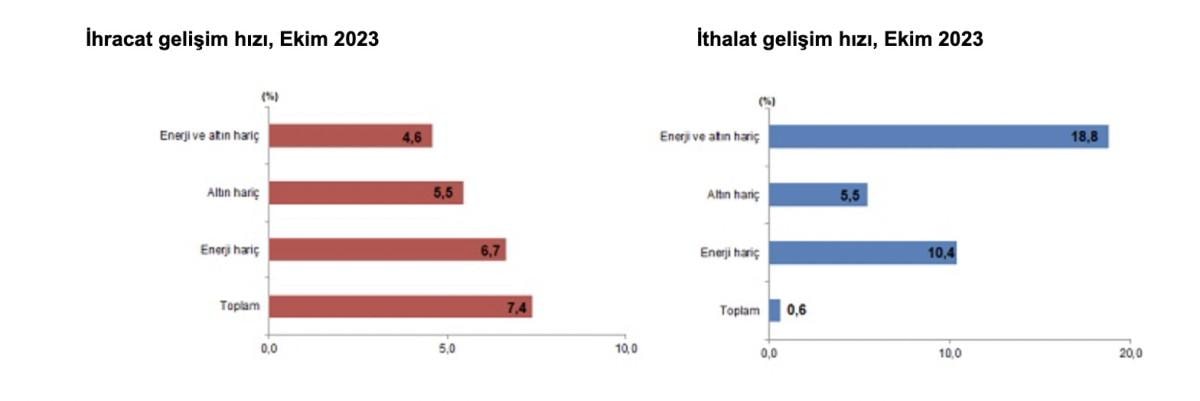 TÜİK ile Ticaret Bakanlığı iş birliğiyle genel ticaret sistemi kapsamında üretilen geçici dış ticaret verilerine göre; ihracat 2023 yılı Ekim ayında, bir önceki yılın aynı ayına göre yüzde 7,4 artarak 22 milyar 871 milyon dolar, ithalat yüzde 0,6 artarak 29 milyar 390 milyon dolar olarak gerçekleşti.