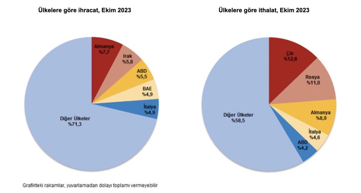 İthalatta Çin ilk sırayı aldı. Ekim ayında Çin'den yapılan ithalat 3 milyar 761 milyon dolar olurken, bu ülkeyi sırasıyla; 3 milyar 233 milyon dolar ile Rusya Federasyonu, 2 milyar 606 milyon dolar ile Almanya, 1 milyar 344 milyon dolar ile İtalya, 1 milyar 247 milyon dolar ile ABD izledi. İlk 5 ülkeden yapılan ithalat, toplam ithalatın yüzde 41,5'ini oluşturdu.