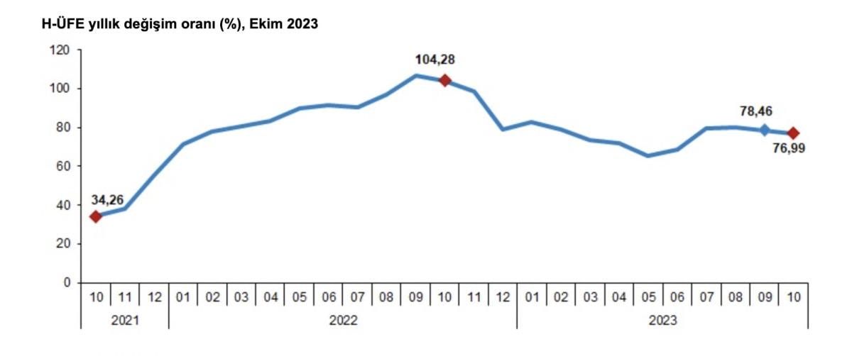 Hizmet Üretici Fiyat Endeksi (H-ÜFE) 2023 yılı Ekim ayında, bir önceki aya göre yüzde 1,21, bir önceki yılın aralık ayına göre yüzde 74,08, bir önceki yılın aynı ayına göre yüzde 76,99 ve on iki aylık ortalamalara göre yüzde 77,10 artış gösterdi.