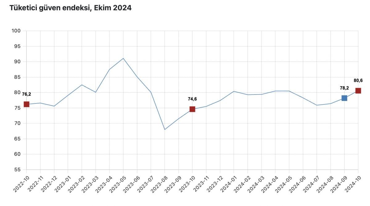 TÜİK ve Türkiye Cumhuriyet Merkez Bankası (TCMB) iş birliği ile yürütülen tüketici eğilim anketi sonuçlarından hesaplanan tüketici güven endeksi, eylül ayında 78,2 iken ekim ayında yüzde 3 oranında artarak 80,6 oldu.