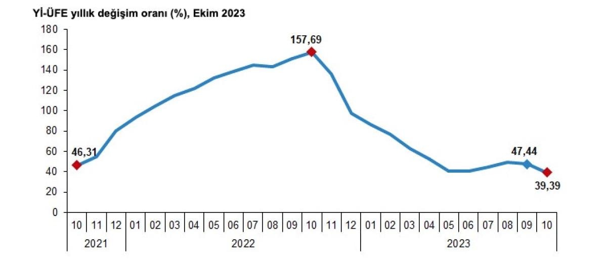 Yİ-ÜFE 2023 yılı Ekim ayında, bir önceki aya göre yüzde 1,94, bir önceki yılın Aralık ayına göre yüzde 38,70, bir önceki yılın aynı ayına göre yüzde 39,39 ve on iki aylık ortalamalara göre yüzde 58,46 artış gösterdi.