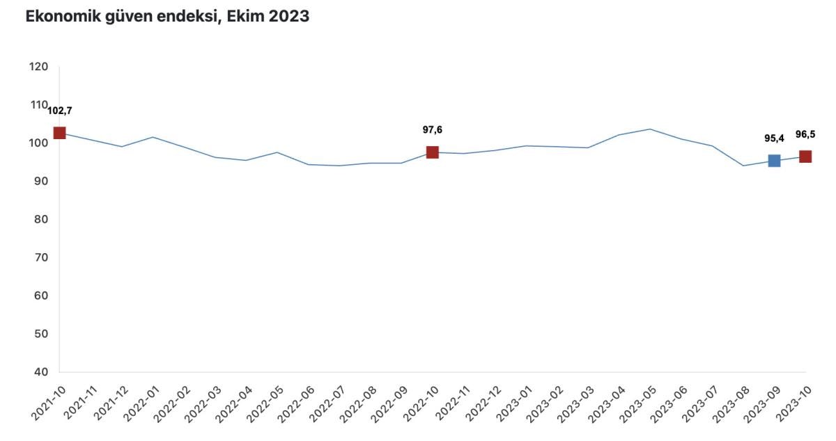 Ekonomik güven endeksi eylül ayında 95,4 iken, ekim ayında yüzde 1,2 oranında artarak 96,5'e yükseldi.