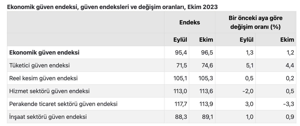 Bir önceki aya göre ekim ayında tüketici güven endeksi yüzde 4,4 oranında artarak 74,6 değerini, reel kesim (imalat sanayi) güven endeksi yüzde 0,2 oranında artarak 105,3 değerini, hizmet sektörü güven endeksi yüzde 0,5 oranında artarak 113,6 değerini, inşaat sektörü güven endeksi yüzde 0,9 oranında artarak 89,1 değerini aldı.