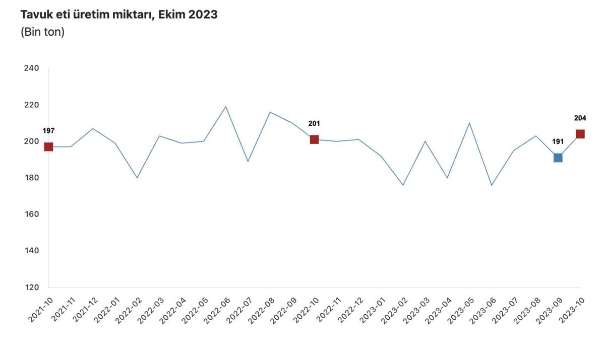 Türkiye İstatistik Kurumu (TÜİK) verilerine göre, Türkiye genelinde tavuk eti üretimi ekimde, geçen yılın aynı ayına göre yüzde 1,4 artarak 204 bin 65 tona, tavuk yumurtası üretimi ise yüzde 3,8 artışla 1 milyar 833 milyon 559 bin adede yükseldi.