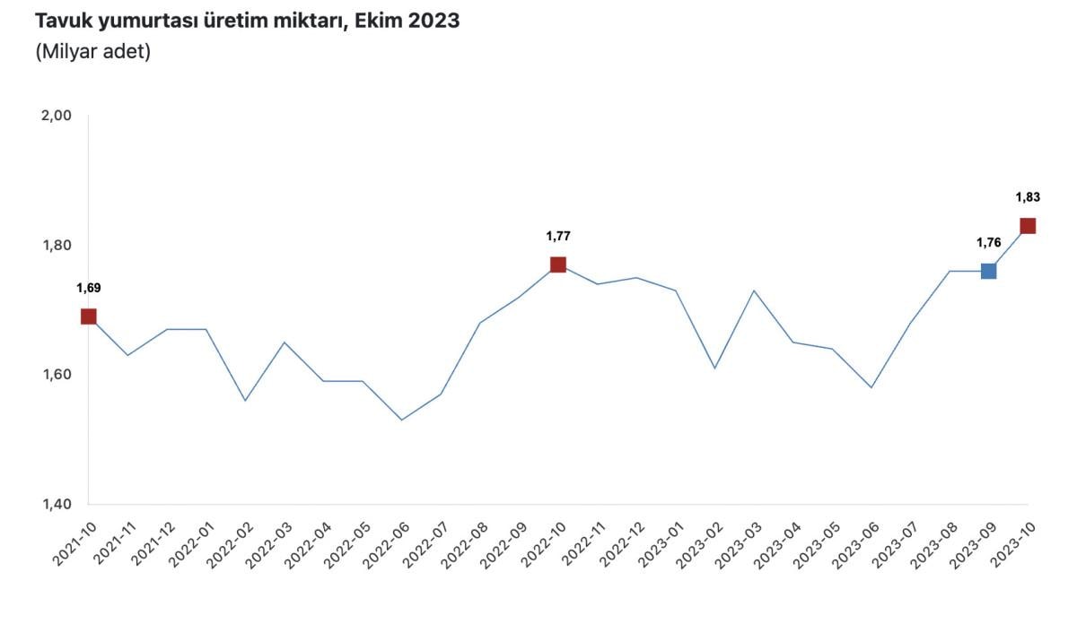 Ekim ayına ilişkin kümes hayvancılığı üretimi istatistiklerine göre, tavuk yumurtası üretimi ise ekimde aylık bazda yüzde 4,4, geçen yılın aynı ayına göre de yüzde 3,8 yükseldi. Bu dönemde 1 milyar 833 milyon 559 tavuk yumurtası üretildi.