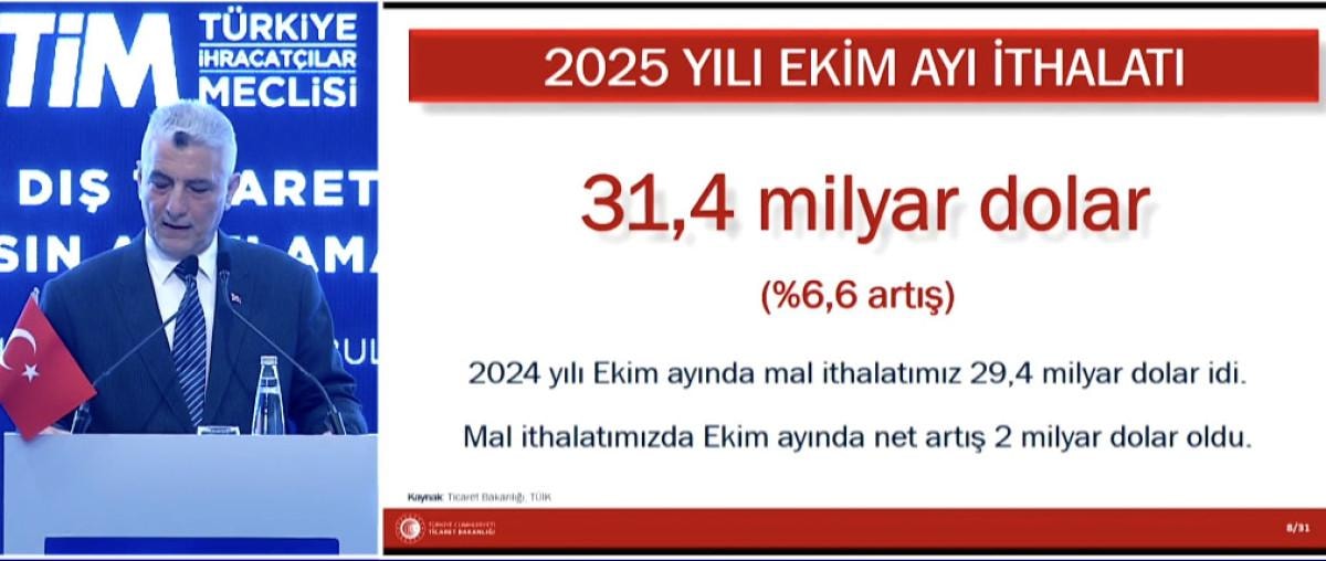 2025 yılı Ekim ayında mal ithalatı ise yüzde 6,6 artarak, 31,4 milyar dolara ulaştı.