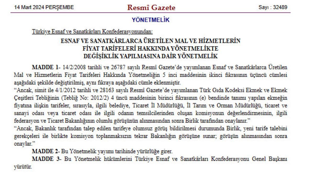 Resmi Gazete'de yayınlanan karara göre, ekmek ve simit fiyatlarının belirlenmesinde artık bakanlığın olumlu görüşü alınacak.