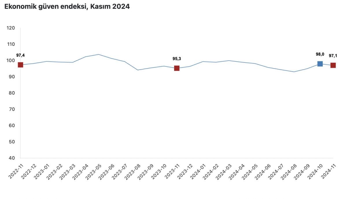 Bir önceki aya göre kasım ayında tüketici güven endeksi yüzde 1 oranında azalarak 79,8 değerini, reel kesim (imalat sanayi) güven endeksi yüzde 1,2 oranında artarak 103,4 değerini, hizmet sektörü güven endeksi yüzde 2,9 oranında azalarak 111 değerini, perakende ticaret sektörü güven endeksi yüzde 0,9 oranında artarak 111,7 değerini aldı.