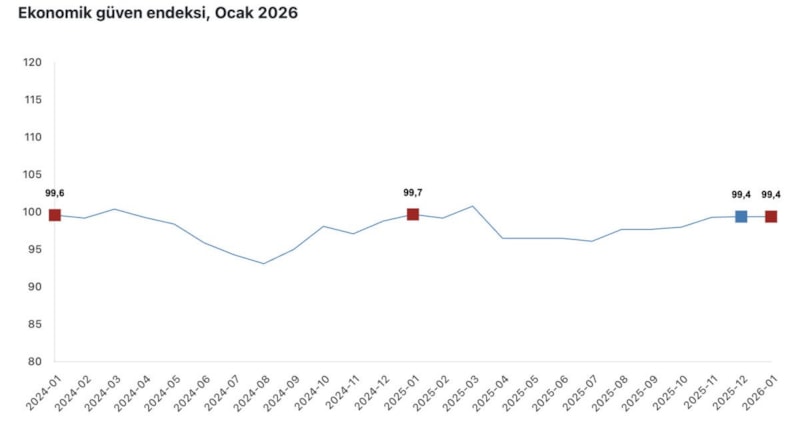 Ekonomik güven endeksi, ocakta aylık bazda değişim göstermeyerek 99,4 değerini korudu.