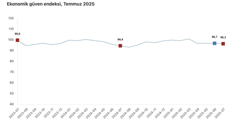 Ekonomik güven endeksi haziran ayında 96,7 iken, temmuz ayında yüzde 0,4 oranında azalarak 96,3 değerini aldı.