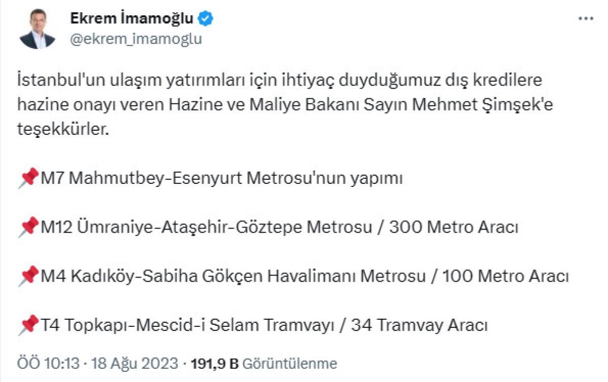 İstanbul'un ulaşım yatırımları için ihtiyaç duyduğumuz dış kredilere hazine onayı veren Hazine ve Maliye Bakanı Sayın Mehmet Şimşek'e teşekkürler.