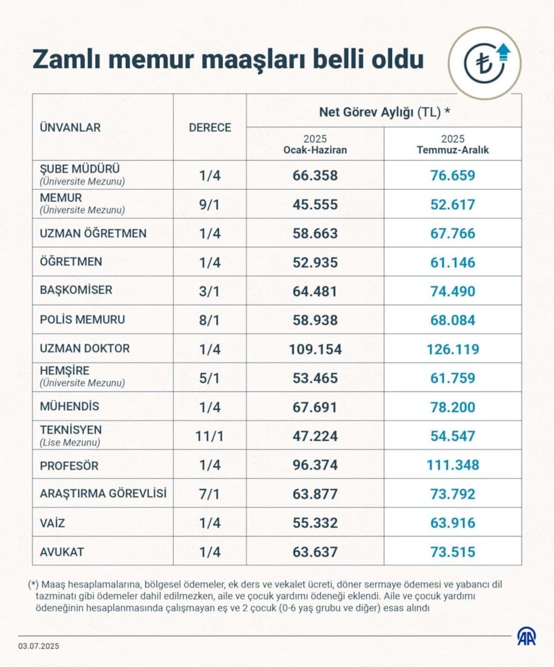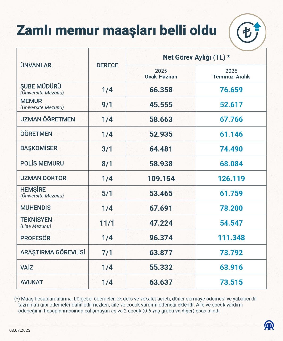 Yeni zamlarla birlikte en düşük memur maaşı 43 bin 726 liradan 50 bin 503 liraya yükseldi.