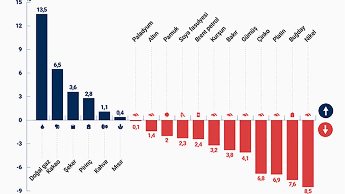 Enerji grubuna bakıldığında ise Brent petrolün varil fiyatı yüzde 2,4 azalırken, New York Ticaret Borsası'nda işlem gören doğal gazın İngiliz Termal Birimi (MMBtu) cinsinden fiyatı yüzde 13,5 artış kaydetti.