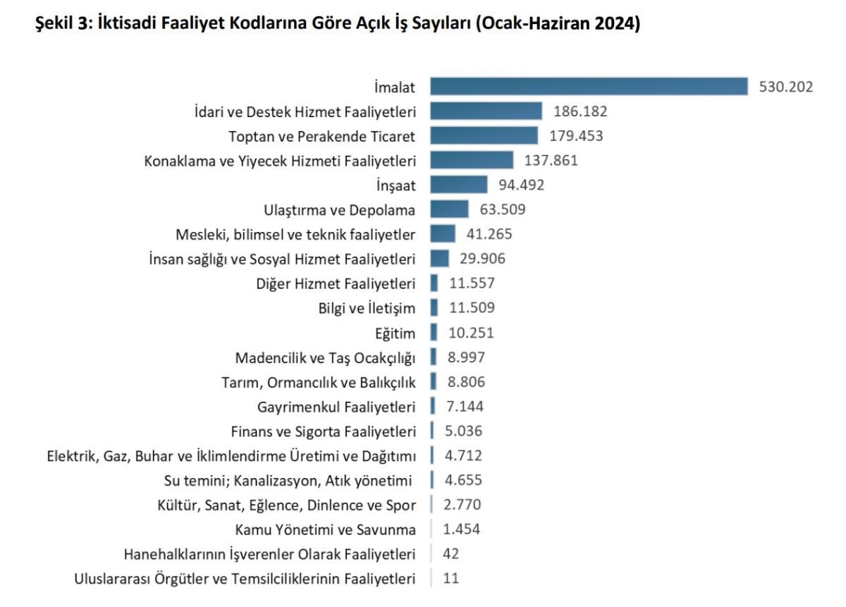 Sektörler itibarıyla en fazla açık iş 530 bin 202 ile imalat sanayi sektöründe yaşandı.