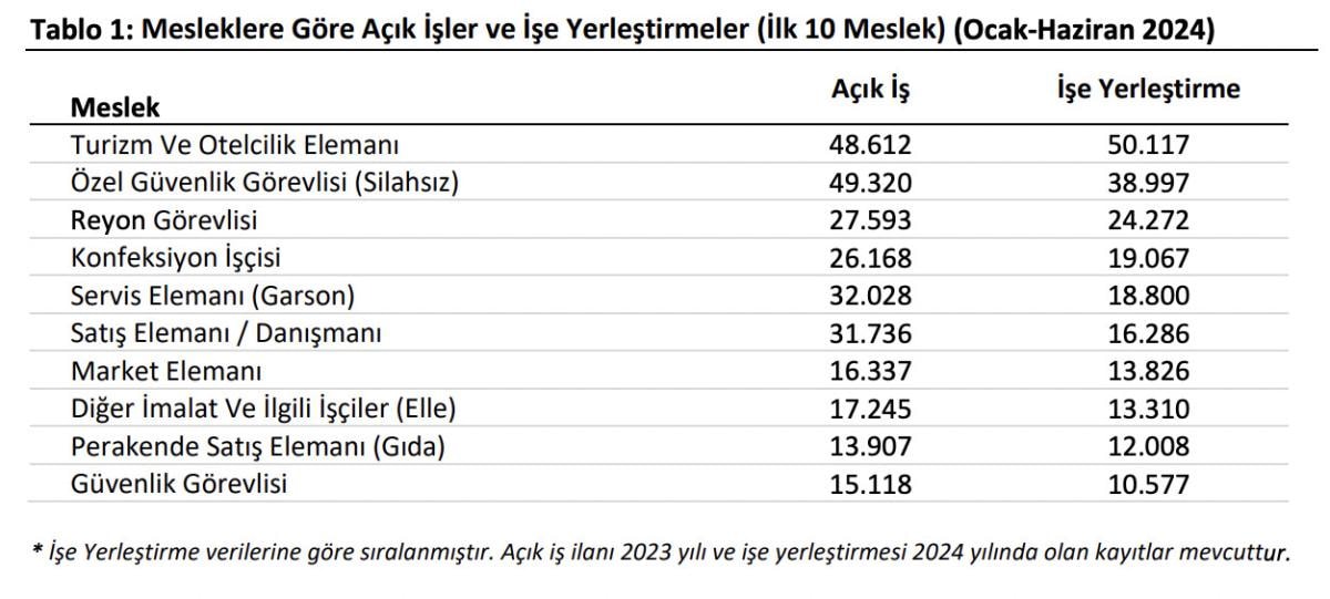 Mesleklere göre, en çok açık iş Özel Güvenlik Görevlisi (Silahsız), Turizm ve Otelcilik Elemanı ve Servis Elemanı (Garson) mesleklerinde oldu.